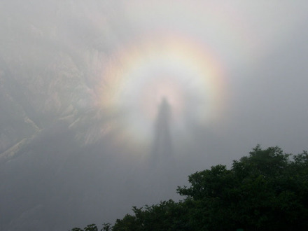由于牯牛降獨(dú)特的地理及氣候條件,極易形成佛光,牯牛佛光清晰規(guī)整,顯現(xiàn)次數(shù)多,時(shí)間長(zhǎng)。每當(dāng)雨過(guò)天晴,云霧匯聚之時(shí),陽(yáng)光穿云透霧,灑向山谷,云海上常會(huì)懸起一輪五彩光環(huán),光芒四射,艷如花盤(pán),繽紛柔和,仿佛一臺(tái)緩緩滾動(dòng)的佛輦,若隱若現(xiàn),妙趣橫生。通過(guò)陽(yáng)光的作用,若游人奔跑跳躍,光環(huán)中的佛影也隨著舉手投足,配合默契,實(shí)為奇觀。