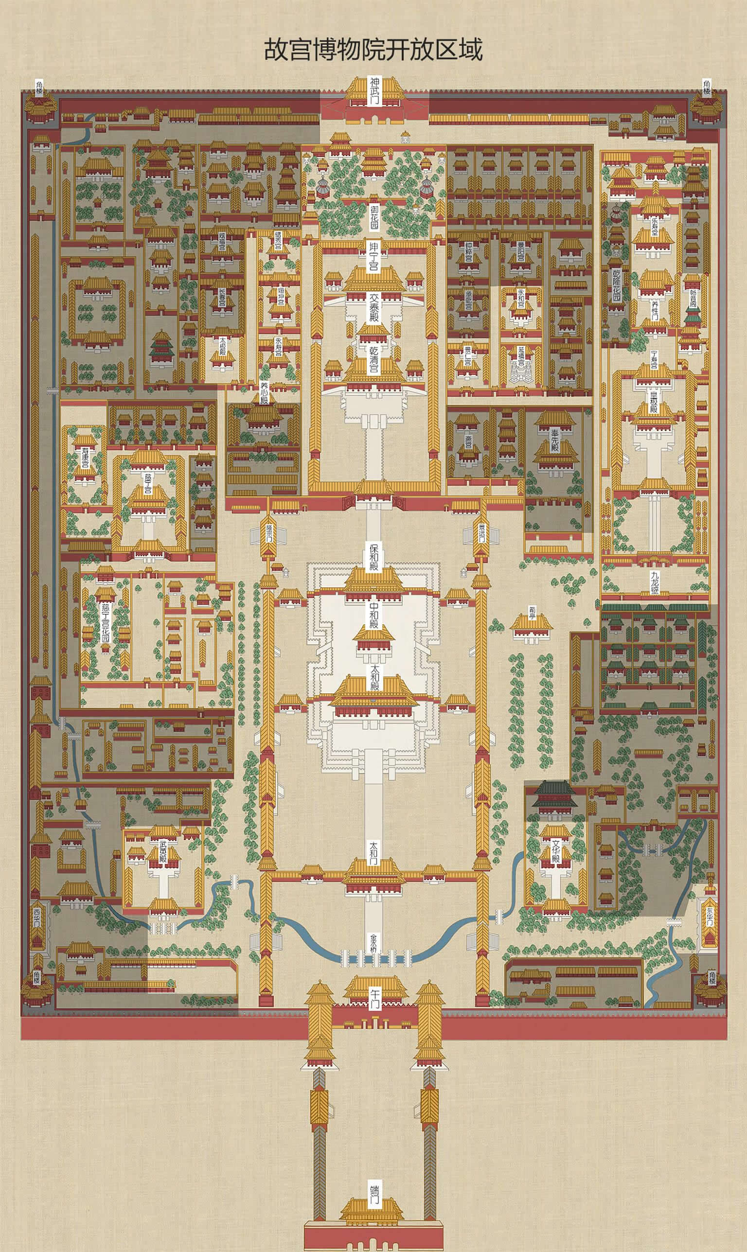 故宮有四個大門,正門名為午門,其平面為凹形。午門后有五座漢白玉拱橋通往太和門。東門名東華門,西門名西華門,北門名神武門。故宮的四個城角都有角樓,高27.5米,十字屋脊。