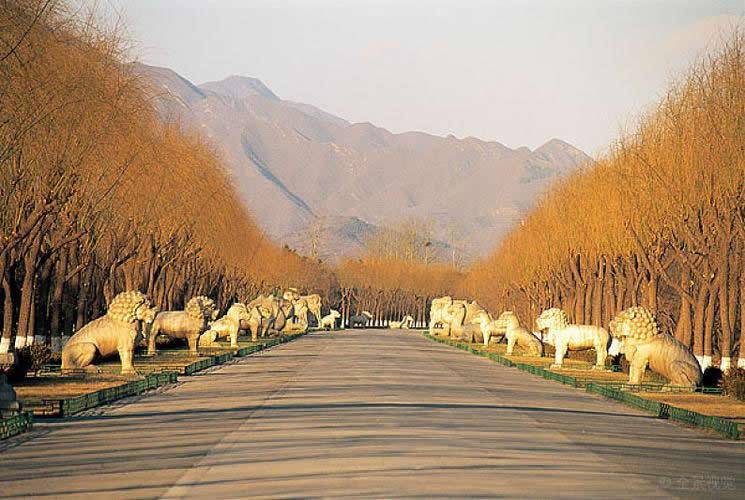 欞星門又叫龍風(fēng)門。由四根石柱構(gòu)成三個門洞,門柱類似華表,柱上有云板、異獸。在三個門額枋上的中央部分,還分別飾有一顆石雕火珠,因而該門又稱“火焰牌坊”。龍鳳門西北側(cè),原建有行宮,是帝后祭陵時的歇息之處。,但后來便成了全陵區(qū)的主陵道了。該道縱貫陵園南北,全長7公里,沿線設(shè)有一系列建筑物,錯落有致,蔚為壯觀。