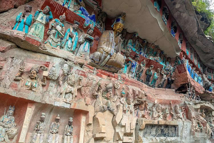 大足石刻開(kāi)鑿于唐永徽元年(公元650年),盛于宋代。現(xiàn)存摩崖石刻造像5萬(wàn)余尊,銘文10萬(wàn)余寧,遍布100多處。其中比較重要的有北山(包括北塔)、寶頂山、南山、石門、石篆山石刻,是大足石刻中規(guī)模最大藝術(shù)價(jià)值最高的石刻造像代表。