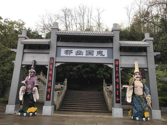 牌坊上最搶眼的就是“鬼城”二字了。鬼城的來歷有幾個(gè)版本,最流行也較為可靠的是“二仙傳說”。西漢劉向所著的《列仙傳》記載,西漢的王遠(yuǎn),字方平,東海人,曾任中散大夫,后棄官隱去,避地平都山(就是名山),入山修道,后修煉成仙升天而去。晉代葛洪著《神仙傳》記載,東漢陰長生,是東漢和帝劉肇陰皇后的曾祖父。他一心求仙學(xué)道,于東漢建光元年在平都山白日羽化升天。到了宋代,陰長生、王方平的名字被人們簡化連讀為“陰王”,即“陰間之王”。于是以訛傳訛,名山就逐漸修起了鬼國的各種建筑,形成了現(xiàn)在的鬼城。民國《酆都縣志》記載:“唐曰仙都,宋改景德,亦稱白鶴觀。按季唐主老聘,俗多好道,沿及宋季,道書誤將陰、王連讀,遂為地獄之說,謂陰司在酆。且引李白詩‘下笑世上士,沉魂北羅酆’二語證之。于是,皆信酆都為鬼國。”鬼城牌坊大門兩旁就是書寫的李白詩句“下笑世上士,沉魂北羅酆”。意思就是說,可笑世間人,百年之后其靈魂都要到豐都鬼城報(bào)到。關(guān)于陰、王二仙的傳說,名山山頂上現(xiàn)在還保存有二仙樓,樓內(nèi)供奉著陰長生、王方平的塑像。