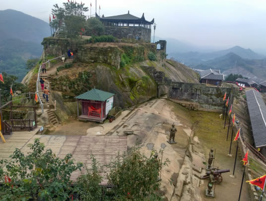 滑石寨位于金帶鎮(zhèn)滑石村3組,是平壩上突兀拔起的一座高260多米的孤峰。孤峰呈紡錘形,四周皆是懸崖峭壁,峰頂平地有6000平方米左右。峰西是一堵傾斜約75度、近10萬平方米的完整石壁,石壁上鑿有一條寬不盈尺的之字形石階,它是通達寨上的惟一路徑。從山下到寨上要走1個多小時路程,其中要經(jīng)過2000多級在石壁上開鑿的石階,山腰到山頂分別有兩道寨門把守。記者在現(xiàn)場看到,山腰一道寨門門楣上清晰刻寫著“未雨,嘉慶二年十月立”字樣。登上寨頂,數(shù)十間木質(zhì)結(jié)構(gòu)的房瓦痕跡依稀可見,青石砌的寨門和寨堡仍保存完好,四道墻體上都開有射擊孔。整個寨堡耗石約1萬多方,工程浩大,令人稱奇。
