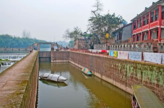 日月門:系大榮寨的四大城門之北門,門樓上有日月亭,門內即煙雨巷,“橋橫古渡煙霞聚,寨聳雄關日月巡”。門內有一甕形古井,深12.2米,內設暗道通往河心,由重一噸多的石板遮蓋。該井系嘉慶年間修建的戰(zhàn)備設施,以備遭兵匪長期圍困時取水傳信之用。