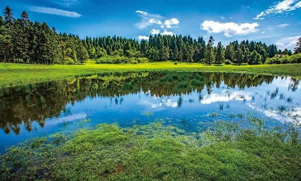 水池四周被險峻的山峰、茂密的森林以及茂密的草叢嚴(yán)嚴(yán)籠罩,池水澄碧如玉漿瓊液般圣潔。無風(fēng)時,波浪不興,靜若處子,倒映著藍(lán)天白云、花草樹木,偶爾有一兩只橫斜水面的飛鳥,宛然一幅水墨淡雅的山水畫。一屢清水如遇微風(fēng)徐來,池面便被揉皺,泛起層層漣漪,粼粼波光,就像下凡的仙女顧盼生情的一雙美目。加上有林濤鳥鳴、夏蟬秋蟲的熱鬧,使仙女池顯得靜寂幽深,親臨此境,如同走進(jìn)幻妙的撣境一般。