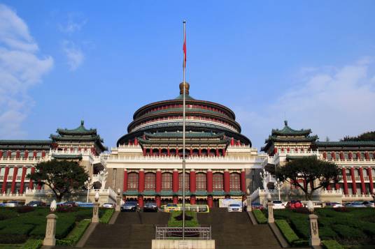 重慶市人民大禮堂,位于重慶市渝中區(qū)人民路173號,于1951年6月破土興建,1954年4月竣工,是一座仿古民族建筑群,是重慶十大文化符號,是中國傳統(tǒng)宮殿建筑風(fēng)格與西方建筑的大跨度結(jié)構(gòu)巧妙結(jié)合的杰作,也是重慶的標(biāo)志建筑物之一。