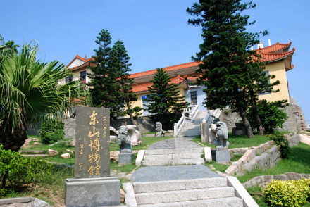 東山博物館,1988年6月開館,1995年3月建成三層樓新館,建筑面積986平方米,占地1400多平方米,館內(nèi)設有“文物室”、“閩臺史前文化關系陳列室”、“陳洪甄書畫室”、“東山建縣八十周年建設成就回顧展“等展室。展出舊石器時代、新石器時代以及歷代文物、圖片、拓片等700多件。其中有東山人“化石”,萬年前舊石器、各種動物(鹿、熊、象、犀牛、羊)化石,還有石器、銅器、陶瓷器、玉器、木雕、古今兵器、書畫、民俗文物及一艘從臺灣飄來的臺灣高山族獨木舟等。