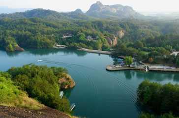 共有蜘蛛巖、水上金字塔、鄂魚峰、金鼠巖、九龍獻(xiàn)瑞、佛洞、八仙巖等景點(diǎn)20多處,是冠豸山風(fēng)景區(qū)又一顆璀璨明珠。 九龍湖內(nèi)港汊眾多,彎彎曲曲,處處是“水上迷宮”,曲徑通幽,是一個(gè)珊瑚狀的湖泊,而主要有四大龍溏坑、飛龍坑、九龍灣坑和碧螺坑。主要景點(diǎn)有: 九龍獻(xiàn)瑞:位于大壩口,九條如巨龍走勢(shì)的山脈齊聚于次,而其中一條飛龍最為生動(dòng)形象,蜿蜒曲伸,猶如從天而降猛龍,正潛翔入海,栩栩如生。 金猴戲犬:大壩側(cè)一組丹霞石柱、石壁楊成一幅美妙、畫圖。正中石柱活象一位魁梧壯漢,為九龍湖守護(hù)神。在它的腳下是“金猴戲犬”圖,金猴激戰(zhàn)天兵天將,面對(duì)一群兇神惡煞的圍攻,騰身一躍,站于“哮天犬”尾巴上搔首弄姿,戲弄敵人。 如意壁:在一塊山崖下方,壁立平整,棱角分明。象一扇洞府山門。(也有人稱它為“無字碑”) 靈蚌含珠:一小山丘形似靈蚌,碩大豐滿,勃勃生機(jī),猶如正在孕育著無數(shù)個(gè)珠的蚌母。 飛龍顯身:九條獻(xiàn)瑞中,其一起在半腰中突然裸露出100余米長(zhǎng)龍身。猶如正在它的敵人酣斗中突然顯出原形,威風(fēng)凜凜震懾對(duì)方。這是一道“丹霞山脊”也稱“石梁”,如攀登這段石梁比黃山“鯽魚背”更險(xiǎn)更奇。