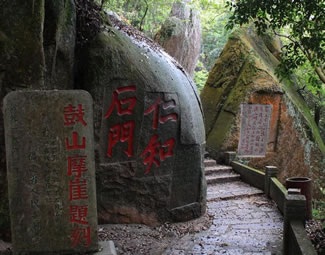 第四亭:“半山亭”。由第三亭至此,共有494級臺階。亭在半嶺,故名。過此亭百余階,有石刻“路通仙苑”,轉(zhuǎn)小徑可達(dá)“十八洞景”!鞍肷酵ぁ焙蠼300階有石刻“桃?guī)r洞口”,往東可到桃?guī)r洞,桃花精舍。