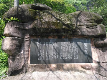 這塊巖石平整如盤。相傳,仙人常降臨這里對弈下棋。巖壁上刻的這兩個篆體字叫“奕臺”。“弈臺”邊上這搖搖欲墜的石頭,風(fēng)吹石動,名曰:“飛來石”。巖壁上還有摩崖石刻“化極磐”三個字,帶有佛教語的味道,意思是:進入幻想中的靈變超脫境界。
