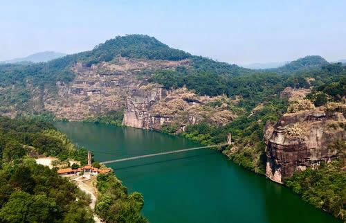 特殊地貌形成兩邊懸崖對峙,這條小澗叫桃花澗,從景區(qū)深處流出,我們的游路也將沿著高山峽谷的縫隙向內(nèi)延伸。桃源洞本沒有“洞”,無論是步行,還是泛舟游覽,都給人一種洞口的感覺右壁的懸崖高達(dá)120米,“桃源洞口”四個大字刻在36米高處,是明萬歷年間,辭官回永安的名士陳源湛于1605年所題,每字兩米見方。