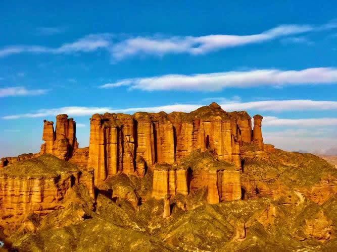 冰溝丹霞以砂巖地貌遺跡景觀為主體,是國內(nèi)窗欞狀宮殿發(fā)育最好、規(guī)模最大的地質(zhì)地貌遺跡,是““窗欞狀宮殿式丹霞”地質(zhì)命名地,被評為“窗欞狀宮殿式丹霞地貌中國第一”。景區(qū)內(nèi)廣泛分布丹霞崖壁、石墻、石柱、尖峰、丘陵等地貌形態(tài),尖峭挺拔,連綿不斷,氣勢宏偉。