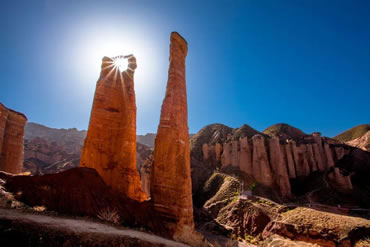 這是冰溝丹霞景區(qū)的又一標(biāo)志性景觀。兩個并排而立的石柱,高約50米,它是由紫紅色砂巖、礫巖、夾砂礫巖構(gòu)成,在流水沖蝕及凍融風(fēng)化剝蝕等外動力作用下,沿著垂直節(jié)理崩塌、解體,使巖墻分割,形成兩個孤立的直徑不同的石柱,均上細下粗、上圓下方,說明風(fēng)化作用是自上而下進行的.石柱下方還基本保留原始節(jié)理切割地層后留下的棱角,形狀像一對逼真的男女生殖器官。左側(cè)的石柱為男柱,頂端如蘑菇;右側(cè)的石柱為女柱。