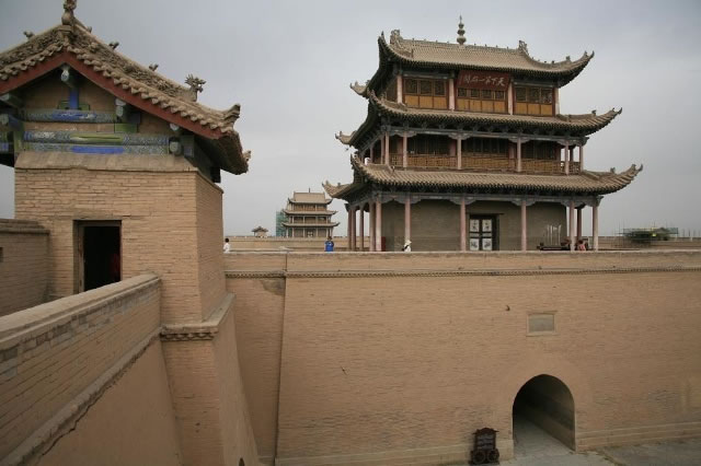 內(nèi)城四角有角樓,也叫“戍樓”,形如碉堡,是守城士兵值勤放哨的地方。南北城墻建有敵樓,是放置兵器的地方。站在這里回望,“光化樓”、“柔遠(yuǎn)樓”及“嘉峪關(guān)樓”三座高大建筑,同在一條中軸線上。這種“過(guò)洞式城門”及高臺(tái)樓閣建筑形式,是中國(guó)幾千年建筑歷史及建筑形式的延續(xù)發(fā)展。