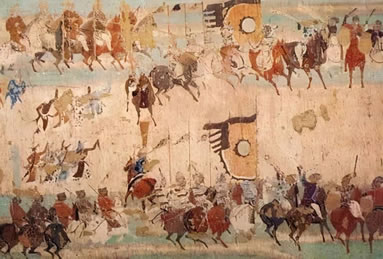 敦煌作為中西交通的樞紐,在壁畫上不僅留下了商旅來往的活動(dòng)情況,還留下了寶貴的交通工具的形象資料。他們有牛馬駝騾、驢象舟船、車轎輿輦等。常用的交通工具車輛類型各異,牛車有“通牛車”、“偏牛車”、敞篷牛車,馬車有駟車、駱車,還有駱駝車、童車、獨(dú)輪車等,特別是保存了中國(guó)為世界交通做出獨(dú)有貢獻(xiàn)的獨(dú)輪車、馬套挽具(胸帶挽具和肩套挽具)、馬蹬、馬蹄釘掌等珍貴的圖像數(shù)據(jù)。西魏第285窟、北周第296窟五百盲賊皈依故事畫,表現(xiàn)了騎著戰(zhàn)馬的騎兵,與身穿褲褶的步兵(強(qiáng)盜)作戰(zhàn)的場(chǎng)面,畫面上畫出了馬鎧,它是保護(hù)戰(zhàn)馬的防護(hù)裝備,古稱具裝,或具裝鎧。第285窟馬鎧的形制齊全,從保護(hù)馬頭的“面簾”、到保護(hù)馬鞍后尻部的“寄生”一應(yīng)俱全。反映了漢代已有的具裝,到北朝時(shí)期已發(fā)展為玩唄成熟的保護(hù)裝備。馬鎧的產(chǎn)生和發(fā)展是中國(guó)為世界軍事裝備所作的獨(dú)有貢獻(xiàn)。