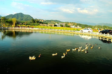 臺(tái)灣度假村位于長(zhǎng)潭旅游區(qū)入口處的虎形山,占地面積218畝,主要開(kāi)發(fā)廣場(chǎng)、朝圣區(qū)、游樂(lè)園、賓館、別墅、展覽館、科技城、美食一條街、農(nóng)業(yè)觀光和苗圃等項(xiàng)目。為一富娛樂(lè)性、知識(shí)性、觀賞性之休閑場(chǎng)所。1998年11月動(dòng)工,1999年,度假村建成戲水樂(lè)園、滑草坪、親子園地、世界蝴蝶館,此館擁有全國(guó)最多的蝴蝶種類,為廣東省最大最具規(guī)模的觀賞樂(lè)園。此外還成功引種臺(tái)灣名優(yōu)稀特水果火龍果。臺(tái)灣度假村風(fēng)光旖旎,富有詩(shī)情畫(huà)意,依山構(gòu)筑的山門別具一格,其景觀廣場(chǎng)、游樂(lè)園、朝圣區(qū)、科技城錯(cuò)落在山水、綠樹(shù)之間,水色塋潔,光可照人。