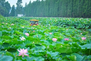 占地110畝呈長塘型的采蓮區(qū),營造出一條混合著人工與天然雕飾美于一體的“綠荷(河)”,風過荷舉,蓮障千重。據(jù)統(tǒng)計,采蓮區(qū)在每年生長旺盛的7、8、9月間,每日可采摘優(yōu)質(zhì)蓮蓬約3000~5000個,蓮蓬果實飽滿,最大的蓮蓬直徑可達18厘米。游客至此,既可親身經(jīng)歷泛舟荷塘,放歌瀏覽蓮葉接天的大千氣勢,更可一嘗采蓮品蓮的田園野趣。