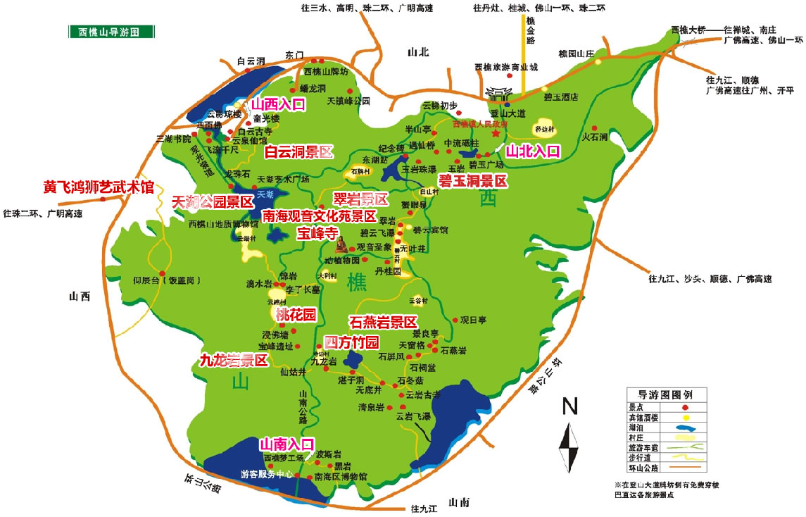 西樵山是一座沉寂了億萬(wàn)年的死火山,自然風(fēng)光美不勝收,山上有72奇峰和36奇洞及大大小小的湖泊、泉瀑和深潭;由于西樵山林深苔厚,儲(chǔ)存了極為豐富的水資源,因而被稱(chēng)為“固體水庫(kù)”。整個(gè)包括石燕巖、 作為“珠江文明燈塔”的西樵山有著6000多年的文明史,古西樵山人創(chuàng)造了燦爛的“雙肩石器”文明;到明清期間,有大批的文人學(xué)子曾隱居在這里,使西樵山獲得了“南粵理學(xué)名山”的雅號(hào);西樵山還是“南拳文化”的發(fā)源地,一代宗師黃飛鴻就出生在這里;西樵山民風(fēng)淳樸、古韻猶存,到這里來(lái)旅游,還能觀賞到山里百姓的婚嫁、生產(chǎn)習(xí)俗以及各種民間游藝活動(dòng)。
