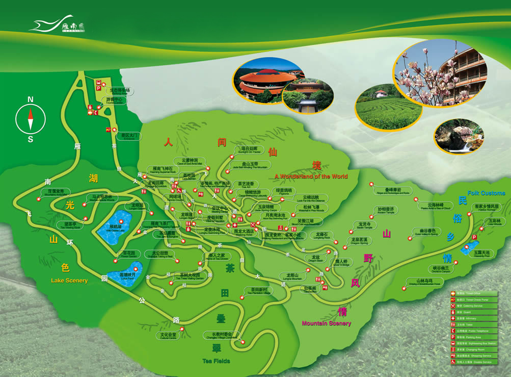 主要景點(diǎn)和設(shè)施有茶田、果園、望茶亭、茶情閣、茶藝館、美食街、生態(tài)谷、游泳池、網(wǎng)球場(chǎng)、人工湖、山水瀑布、游客中心、會(huì)議中心、圍龍食府、山莊別墅、圍龍大酒店、茶花大觀園等。