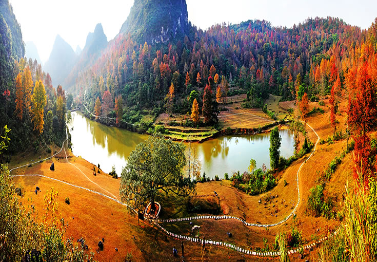 紅葉森林公園位于德保縣東北側(cè)方向,國家AAAA級旅游景區(qū)暨自治區(qū)級森林公園,距縣城3.5公里,交通便利。公園規(guī)劃面積1036.5公頃,該公園核心景區(qū)為紅楓湖游覽區(qū)和紅葉谷游覽區(qū),以紅楓為主題。金秋時節(jié),楓葉似火,湖水輕柔,互襯互耀,頗具詩情畫意。公園的紅葉品種主要以楓香為主,葉子顏色分別有深紅、絳紅、霞紅、黃紅混合等,觀賞時間較長,有著“德保楓葉賽九寨”的美譽(yù),是秋季里一道亮麗的風(fēng)景線。公園以紅楓湖、紅葉谷一帶的紅楓林為依托,襯托著多姿多彩的紅葉森林景觀、森林生態(tài)景觀、底蘊(yùn)深厚的人文景觀和綺麗迷人的水文景觀,將紅楓湖、上章湖、紅葉谷構(gòu)成休閑避暑游覽的大旅游圈,景區(qū)內(nèi)上章水庫和百布水庫交相輝映,總庫容量分別為365萬立方米和190萬立方米;有效灌溉面積分別為2200畝和2000畝。目前,景區(qū)各項(xiàng)基礎(chǔ)設(shè)施正在逐步完善。德保境內(nèi)有10萬多畝連片的紅楓林,遍布城關(guān)、那甲、馬隘、巴頭等鄉(xiāng)鎮(zhèn)。除紅葉森林公園外,馬隘至巴頭一線還有許多別具特色的賞楓景點(diǎn),無一不令人流連忘返。