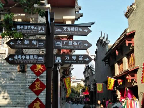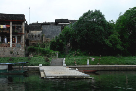 碼頭多用料石鑲砌,亦有因礁而設(shè)者。它們長10余米,寬約3米,皆伸入江底,浮出水面,呈長方形平臺(tái)狀。比起桂北一般圩鎮(zhèn)的碼頭來,它們顯得穩(wěn)重,大氣;若與武漢的江岸碼頭,北海的深水碼頭相比,則顯得小巧玲瓏,古樸秀美。它們順江排列,而兩者之間卻并不等距,具有一種錯(cuò)落感,富有美學(xué)價(jià)值。碼頭靠岸的一端,多連有一段平地,或古榕濃蔭,或龍亭飛角,或丹桂飄香,或鳳竹搖曳,兼有實(shí)用和觀賞價(jià)值。碼頭與鎮(zhèn)區(qū)均有巷道相通,依坡砌級(jí),石板鋪路,高墻夾擁,逼深邃,天光一線,給碼頭平添一種縱深感和活力。