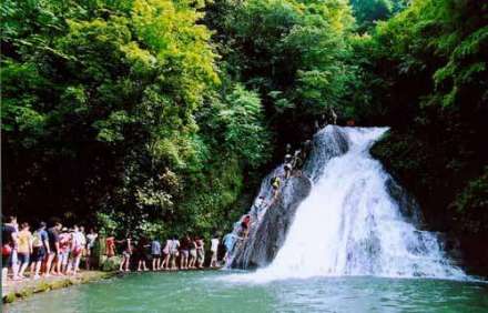 瀑布源頭比漓江水面高出180米,是我國唯一一個(gè)由地下涌泉形成的多級(jí)串連瀑布;是一個(gè)因鈣華沉積作用可逐漸長高而改變景致的瀑布。八級(jí)瀑布形態(tài)各異,有的如鴛鴦戲水,有的如蛟龍噴水,有的懸于長滿青苔的巖壁上,瀑水如布,水紋清晰可鑒,呈白色透明狀,猶如噴霧行云;有的水流集中下注跌入深潭濺起層層水霧浪花,猶如細(xì)雨蒙蒙,瀑布兩岸林木蔥郁,蔭蔽幽靜,水質(zhì)清洌,涼爽甘甜。山腳亞熱帶雨林濃郁,藤蔓垂壁,叢林險(xiǎn)徑,三千多畝的楓樹和馬尾松,風(fēng)吹林動(dòng),鳥語花香,令人有回歸自然的親切感。到了深秋時(shí)節(jié)的紅楓更是別一番“霜林盡染,漫山紅遍,紅葉鋪滿山徑”的美景。