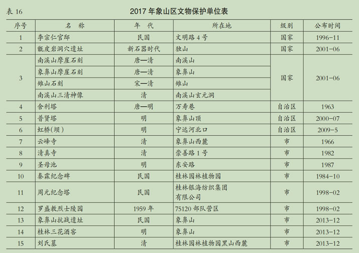 象山區(qū)有全國重點(diǎn)文物保護(hù)單位3個(gè),自治區(qū)級文物保護(hù)單位3個(gè),桂林市級文物保護(hù)單位9個(gè)。