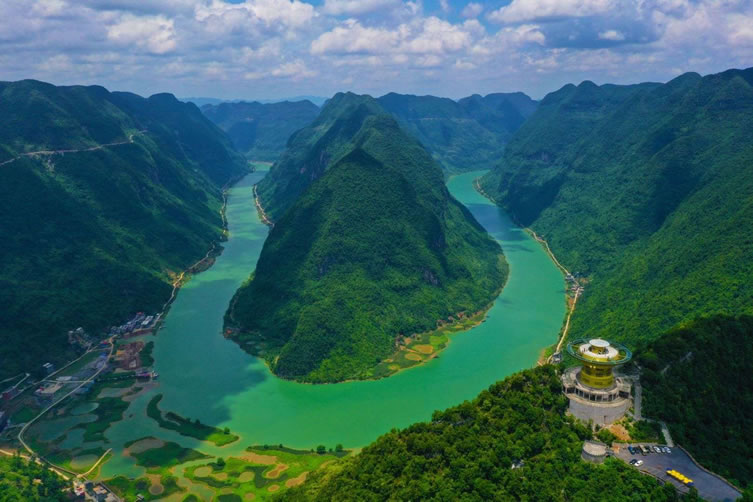 “紅水河第一灣”是國家AAAA級景區(qū),位于三石鎮(zhèn)板文村。紅水河在流經(jīng)東蘭縣板文村境內(nèi)拐了一個(gè)大彎,形成一個(gè)“U”字型的大峽谷,山環(huán)水繞,碧如玉環(huán),中間主峰如神龜靜臥,兩岸峰叢對稱排開,谷底河灘幾十個(gè)水譚或?qū)ΨQ、或連通,奇妙非常。山間林木翠綠蔥蘢,獼猴跳躍,百鳥爭鳴。在山頂上銅鼓觀景玻璃臺觀賞第一灣奇景,若在晨起碰到云霧天氣,霞光普照,霧繞神灣,幻若仙境。有詩描述:“一灣驚天下,回首造高峽,千山還壯美,奔流再出發(fā)!”該景區(qū)是紅水河的精華河段,是攝影、探險(xiǎn)、休閑度假的好地方。