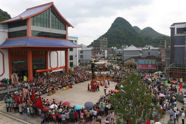 位于鐘山縣城西面公安鎮(zhèn)大田村,距縣城約十公里,此戲臺(tái)建于清光緒四年(即1878年),為磚、石、木結(jié)構(gòu),呈凸字形,通高10余米,由前臺(tái)和后臺(tái) 組成,前臺(tái)面寬6.37米,深5.5米;后臺(tái)寬10.12米,深3.6米;基高1.8米。整座戲臺(tái)青石青磚,雕工極為精美圓潤(rùn),八柱梁構(gòu)架,八角藻井復(fù) 頂,鼓石墊柱,青磚砌墻,青石為基,基旁雕以八仙賀壽,鑿雙龍以戲珠,臺(tái)上鏤兩虎以扶角,嵌二獅以呈瑞,后屏風(fēng)飾以山川樓閣,彩鳳仙鶴等木雕,工藝精湛, 構(gòu)圖和諧。戲臺(tái)除古樸典雅、雄偉壯觀,且符合力學(xué)、聲學(xué)原理,整座戲臺(tái)屬水口廟附屬建筑,隱映于古樹(shù)秀竹之中,清澈的溪流環(huán)繞其中,整個(gè)環(huán)境優(yōu)雅別致,清 靜恬適,為廣西不可多見(jiàn)的古戲臺(tái)之古代建筑之一。1981年列為廣西壯族自治區(qū)重點(diǎn)文物保護(hù)單位。該戲臺(tái)所處村莊大田村也是一個(gè)很有特點(diǎn)的村莊,老屋、古 榕、古樟在池塘的映襯下顯得特有韻味。