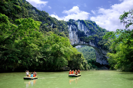 布柳河仙人橋景區(qū),地處樂業(yè)縣新化鎮(zhèn)磨里村布柳河大峽谷,距縣城51公里,該峽谷全長16.9公里。沿河兩岸綠樹成蔭,古樹繁多,野猴成群,鳥語鳴啼,有“植物的王國,鳥類的天堂”之美稱,河里魚兒穿梭,既可漂流,又可觀光旅游,被專家稱為“桂西第一漂”。尤為奇特的是,布柳河上還有一座由三座大山塌陷形成的天然石拱橋,坐落于漂流河段下游。石橋天成,鬼斧神工,橋拱對稱,拱底平滑,當(dāng)?shù)厝朔Q為“仙人橋”。仙人橋拱孔跨度177.14米,橋?qū)?9.3米,橋身長280米,橋身厚78米,總橋高165米,拱高87米,像一條巨龍橫跨在河的兩岸,絕景天成,氣勢雄偉,是罕見的天然石拱橋。被專家稱為世界上最大、最美的水上天生橋,具有極高的觀賞價(jià)值。