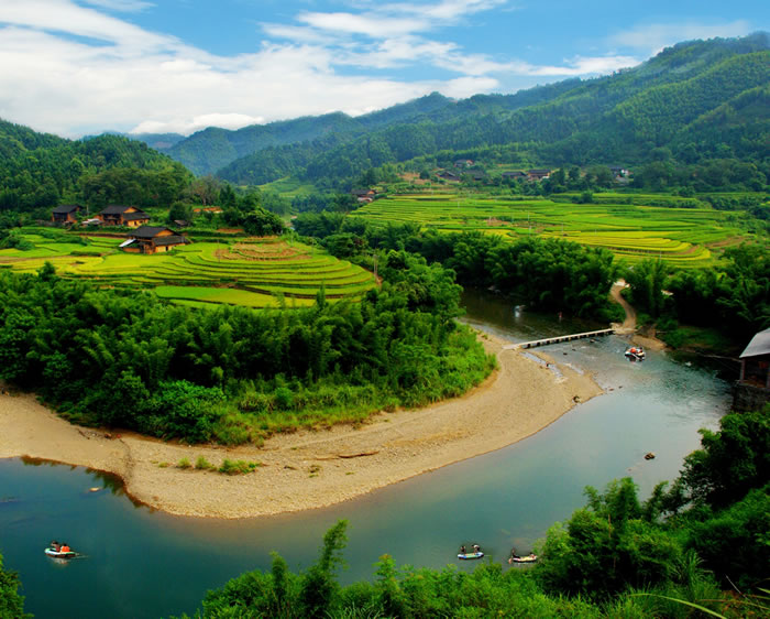 地形地貌 融安縣地形似腿狀,地勢東北高西南低。東北部的廣福頂山脈是與臨桂、永福、龍勝、三江等縣的自然分界線。境內(nèi)山脈中,最高的廣福頂海拔1457.8米,往東延伸的有三陽頂、九峰山、香爐嶺、獅子嶺、黑石界、十二瓣山、波有嶺等,海拔均在1000米以上。往北延伸的有從白山、翁古頂、雨花山、貓頭頂?shù)龋0我嘣?000米以上。南部邊緣有九頭山、北寨大山、大將山等,海拔在400米以上。西部邊緣是元寶山脈延仲來的敲邦嶺、牛欄山、圣山嶺等,海拔在700米以上。