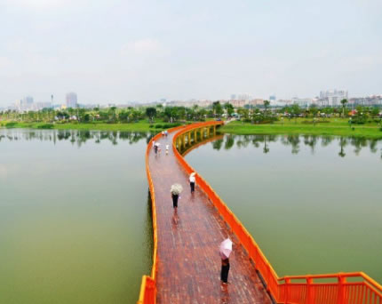 梧州園博園的整體景觀結構為“一軸九片區(qū),三廊多節(jié)點”。一軸,指的是西入口的入園景觀軸,從西入口的龍湖大道開始,經由跨湖橋一直延伸到東部山體;九片區(qū),是指沿著蒼海湖的東西兩岸,帶狀分布的原始地貌各異的九大片區(qū),分別為西岸濱水景觀區(qū)、水岸林舍片區(qū),蒼海公園片區(qū)等;三廊,指的市西岸親水綠廊,東岸濱水游憩體驗區(qū),以及核心城市展示廊。而多個各具特色的景觀節(jié)點,將有如明珠般分布在園博園各處,分別展示梧州的歷史文化、風土人情,充分體現“西江明珠,嶺南新韻”的主題。