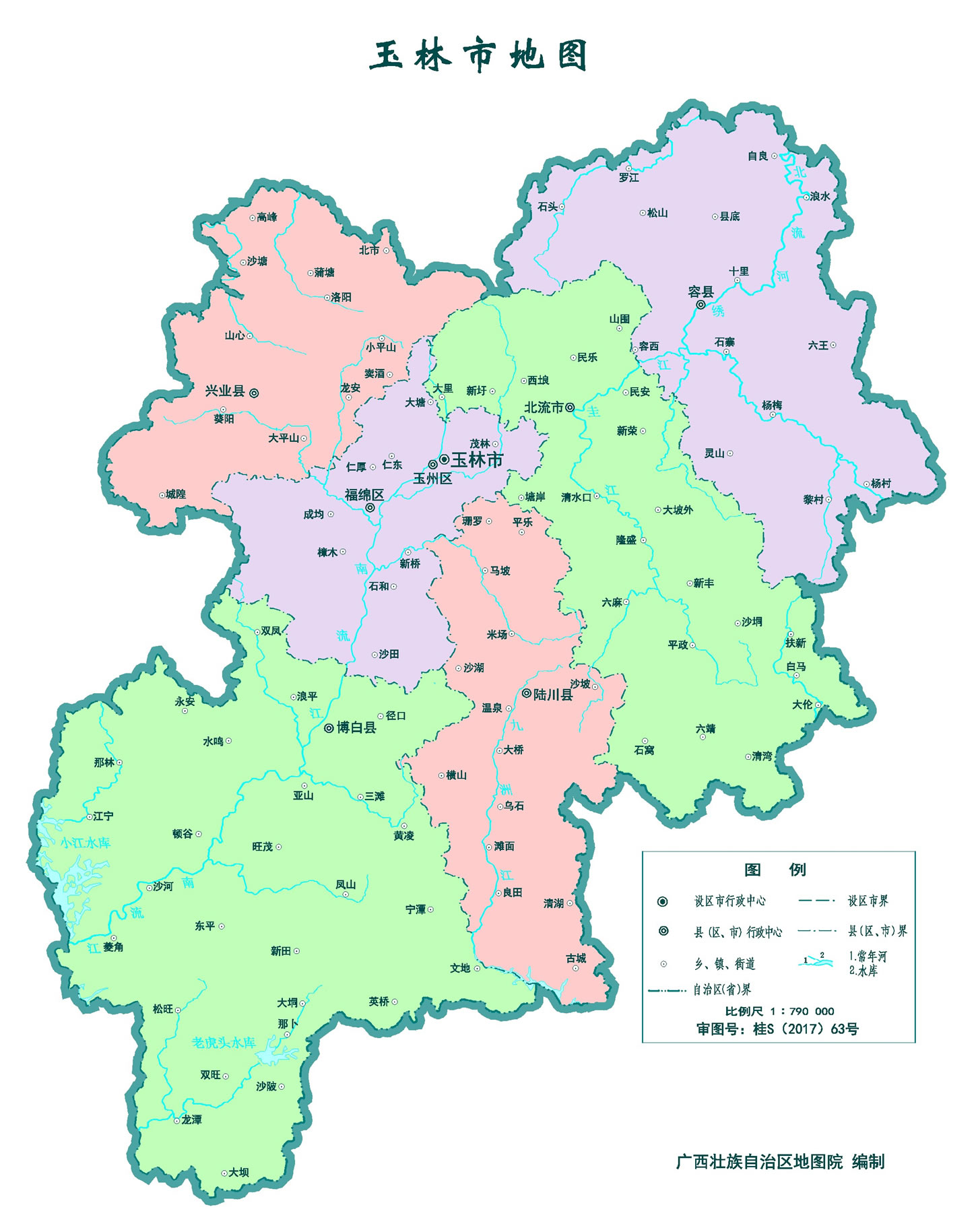 玉林市轄2個(gè)市轄區(qū)、4個(gè)縣,代管1個(gè)縣級(jí)市: