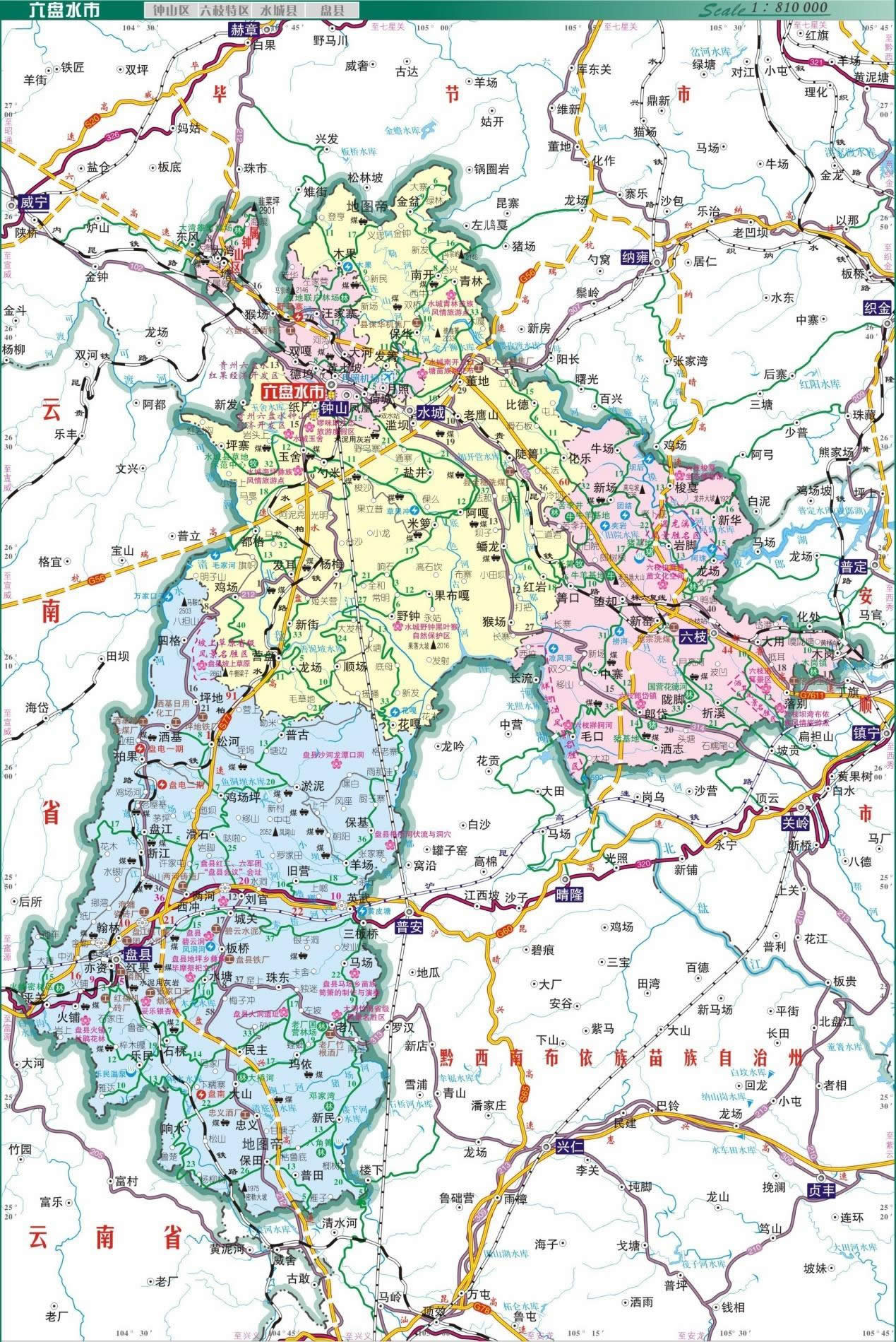 六枝特區(qū) 面積1799.48平方千米,人口75.83萬,政府駐九龍街道團結(jié)路,下轄3個街道、9個鎮(zhèn)、6個鄉(xiāng)