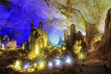積七萬多平方米,最寬處達(dá)一百七十五米,最高處一百五墕主。洞內(nèi)地勢起伏,石峰叢立,如重巒疊嶂,山間常有云霧繚繞。有金色塔山、成林玉樹,還有螺旋狀的高大石柱“螺旋樹”。