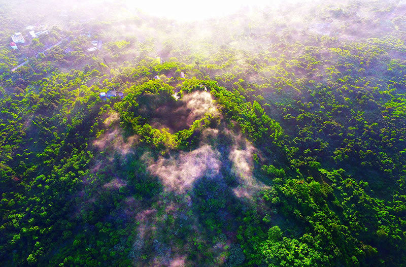 雷瓊?诨鹕饺菏澜绲刭|(zhì)公園,4A級景區(qū),世界地質(zhì)公園,國家地質(zhì)公園。位于?谑形髂鲜芥(zhèn),屬地塹一裂谷型基性火山活動地質(zhì)遺跡,也是中國為數(shù)不多的全新世(距今1萬年)火山噴發(fā)活動的休眠火山群之一,具有極高的科考、科研、科普和旅游觀賞價值。 地質(zhì)遺跡主體為40座火山構(gòu)成的第四紀(jì)火山群。園區(qū)在火山錐、火山口及玄武巖臺地上發(fā)育熱帶雨林為代表生態(tài)群落,植物有1200多種,果園與火山景觀融為一體,為熱帶城市火山生態(tài)的杰出代表?偯娣e108平方公里。主要景點有馬鞍嶺、雙池嶺、仙人洞、羅京盤等。
