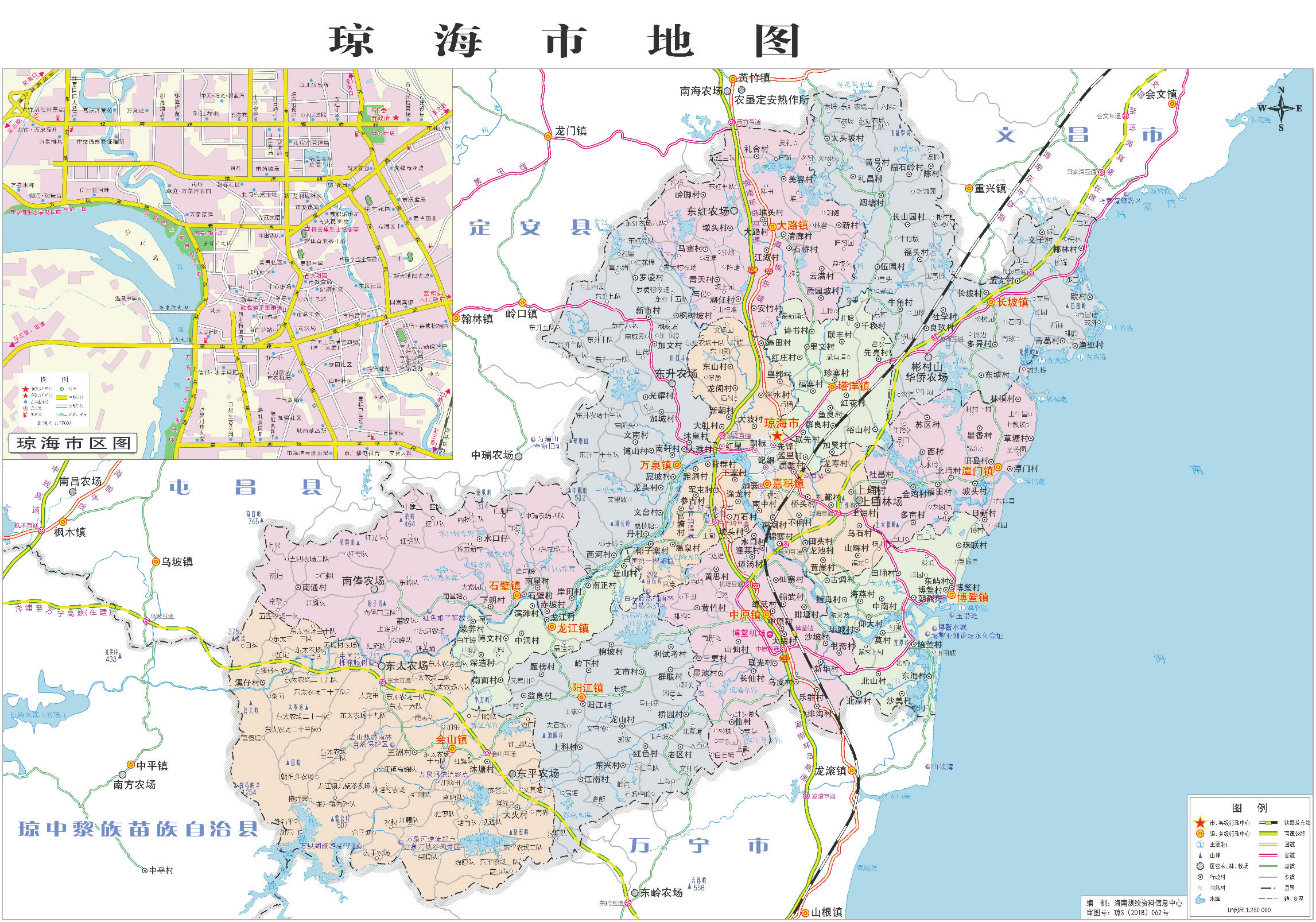 鎮(zhèn):嘉積鎮(zhèn)、萬泉鎮(zhèn)、石壁鎮(zhèn)、中原鎮(zhèn)、博鰲鎮(zhèn)、陽江鎮(zhèn)、龍江鎮(zhèn)、潭門鎮(zhèn)、塔洋鎮(zhèn)、長坡鎮(zhèn)、大路鎮(zhèn)、會山鎮(zhèn)