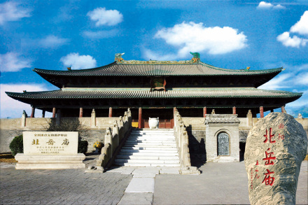 北岳廟,原名“北岳安天元圣帝廟”。位于保定市曲陽縣境內(nèi),是漢代和清朝封建皇帝遙祭北岳恒山的地方。北岳廟建于北魏宣武帝年間(500~515年),唐開元二十三年(735年)擴(kuò)建。明嘉靖年間(1522~1566年),北岳廟規(guī)模達(dá)到頂峰。清順治十七年(1660年),改祀北岳于山西渾源,曲陽北岳廟逐漸荒廢。北岳廟主要建筑平面布局呈“田”字形,長達(dá)542米、寬321米,坐北朝南排列在一條垂直中軸線上,由南往北依次為登岳橋、神門、牌坊、朝岳門、御香亭、凌霄門、三山門、飛石殿、德寧之殿、后宅門、望岳橋。