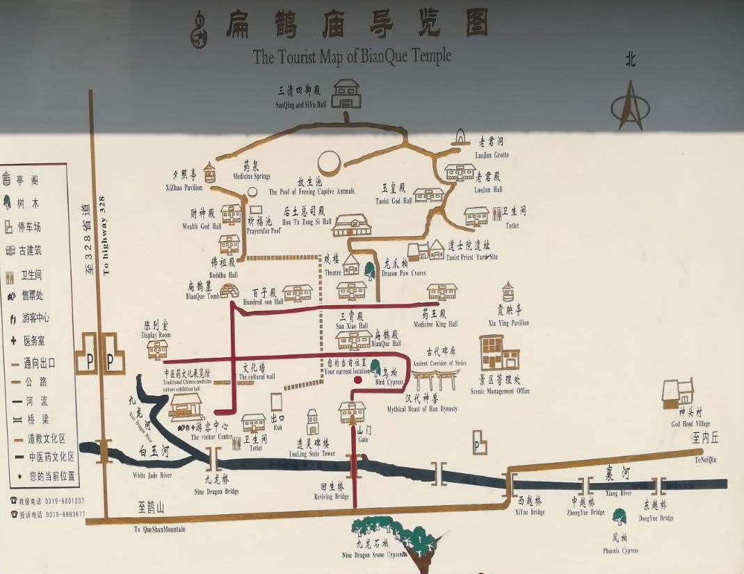 扁鵲廟古建筑群處在群山環(huán)抱之中,廟殿布局嚴(yán)謹(jǐn),木石結(jié)構(gòu),描梁畫棟,奇脊飛檐,紅磚綠瓦?傮w呈長方形,按天(玉皇)、地(后土)、人(扁鵲)三才布局,F(xiàn)存有回生橋、山門、扁鵲殿、后土總司殿、玉皇殿、三清殿、老君殿、財(cái)神殿百子殿、三霄殿、藥王廟等19座,占地面積15萬平方米,以扁鵲廟為中心形成了龐大的古建筑群,總體布局合理,結(jié)構(gòu)緊湊;是北方典型的道教廟群。其中扁鵲殿、扁鵲墓、透靈碑、回生橋、九龍柏、古代碑廊、三清殿、漢代神獸,為扁鵲廟八大景觀。