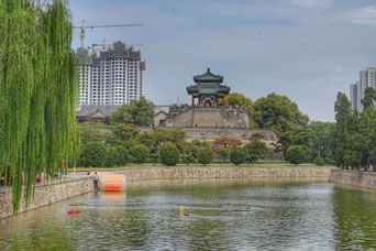 東湖西岸邊就是武靈叢臺(tái),登上叢臺(tái)極目遠(yuǎn)眺,可以看到西邊的太行山和西南趙國都城遺址趙王城蜿蜒,西北便是趙國的鑄箭爐、梳妝樓和插箭嶺的遺址。叢臺(tái)西面是一片花圃植物區(qū)名叫槐園,內(nèi)設(shè)立一座亭臺(tái)與城堡郵票發(fā)行紀(jì)念碑,南面與承界橋相隔是二度梅園,西南通過曲蘭橋,可登苑在亭,就是叢臺(tái)中湖,湖中有一建筑就是望諸榭。中湖西岸邊是梧桐苑和游船碼頭區(qū),中湖南岸就是百花園和袨服亭。