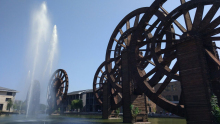 水車風情街,水車群組6臺,高28米,直徑20米,單體重量9.6噸。嵖岈水車外形酷似古式車輪,提水26米高,輪輻中心是合抱粗的輪軸,圓輪四周斜裝有50個左右的木斗,以及比木斗多一倍的橫板。