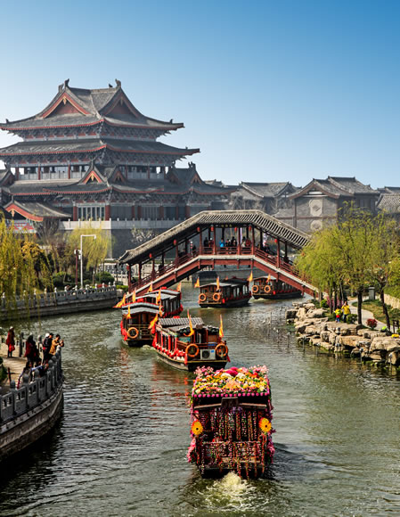 清明上河園位于開封古城內(nèi)西北隅,是以宋代張擇端的名《清明上河圖》為藍本,集中再現(xiàn)原圖風物景觀的大型宋代民俗風情游樂園,是國家AAAAA級景區(qū)。占地面積510畝,主要建筑有城門樓、虹橋、街景、店鋪、河道、碼頭、船坊等。園區(qū)按《清明上河圖》的原始布局,集中展現(xiàn)宋代諸如酒樓、茶肆、當鋪、汴繡、官瓷、年畫等現(xiàn)場制作;薈集民間游藝、雜耍、盤鼓表演;神課算命、博彩、斗雞、斗狗等京都風情,并根據(jù)宋氏歷史故事表演“文包武楊”及宋代婚禮習俗等節(jié)目。