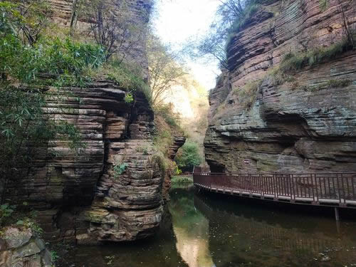 紅巖絕壁,飛瀑幽潭,狹溝深谷,奇石綠蔭,組成世界上罕見(jiàn)的山水畫(huà)廊。