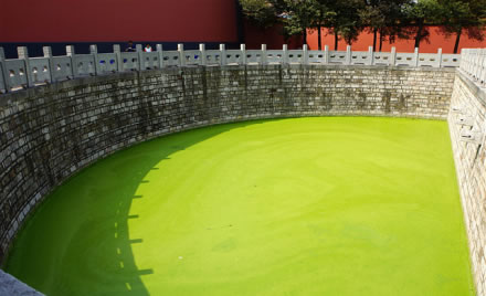 宮墻內(nèi)為泮池,兩江總督李鴻章命江寧知府涂宗瀛在朝天宮前建泮池,是文廟的標志性建筑,池壁和護欄都系青石所建,南側(cè)有涵洞,池內(nèi)終年碧水清波。墻內(nèi)有按原樣恢復的半月形泮池,圍以青石欄桿,池內(nèi)碧水清波。