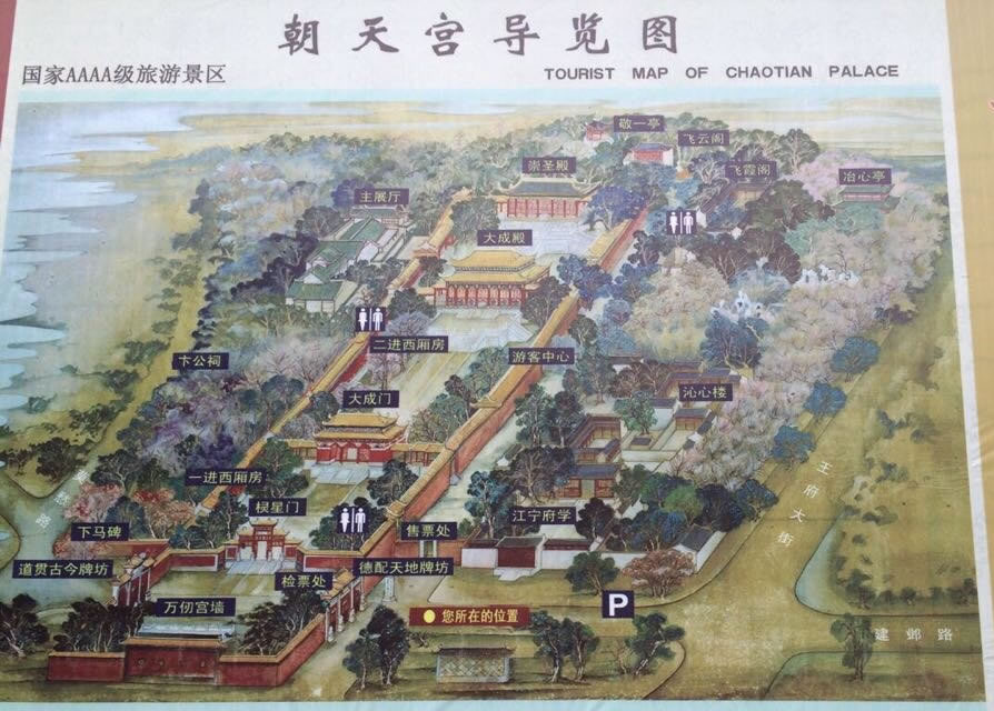 清朝道光年間因朝天宮屢遭火災,當時風水家把朝天宮大山門由朝正東,改為偏向東南。