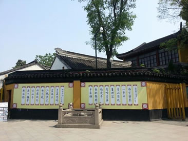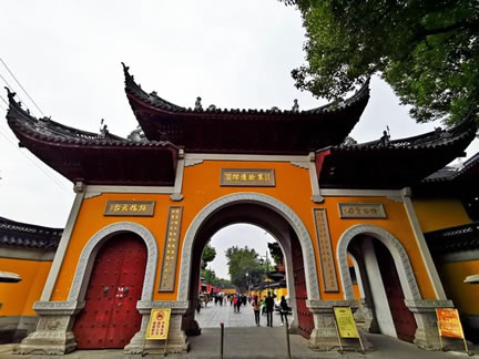 寒山寺殿宇大多為清代建筑,主要有大雄寶殿、藏經(jīng)樓、鐘樓、碑廊、楓江樓、霜鐘閣等。寒山寺的建筑布局沒有嚴(yán)格的中軸線。寒山寺山門前面的石拱圈古橋是江村橋,橋堍與山門之間那垛黃墻稱照壁。山門兩旁兩棵古樟。黃墻內(nèi)古典樓閣飛檐翹角,右為楓江樓,左為霜鐘樓,都源于楓橋夜泊詩。佛龕背后一尊威風(fēng)凜凜的將軍像,面朝里,對著大雄寶殿,手拿金剛杵,也叫降魔杵,那是韋馱,位居四大天王手下的三十二神將之首。