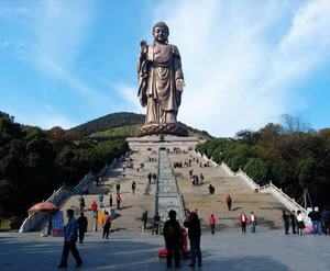 矗立在小靈山南麓的靈山大佛,包括蓮花座在內(nèi)通高為八十八米,相當(dāng)于一幢三十馀層樓房的高度,比“山是一尊佛,佛是一座山”的四川樂山大佛還要高出十七米,是迄今為止我國(guó)最高的巨型佛像。如果加上三層座基,總