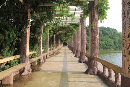 紫藤文化長廊位于三仙湖東北岸,建于2007年10月。長133米,寬3.8米,高4米,長廊中有76根柱子,柱子上有從古至今的76位名人題寫的詩詞。紫藤文化長廊6個(gè)大字,由原中央電視臺(tái)副總編輯、中央電視臺(tái)書畫院院長趙立凡寫。