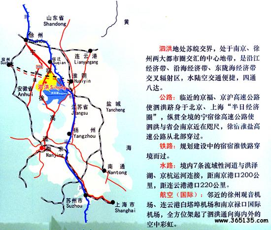 泗洪地處蘇皖交界,位于南京、徐州兩大都市圈交匯中心地帶,是沿江經(jīng)濟帶、沿海經(jīng)濟帶、東隴海經(jīng)濟帶交叉輻射區(qū)。水陸空交通便捷,四通八達。
