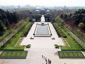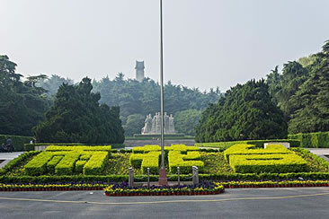 兩側(cè)的環(huán)陵大道可直達雨花臺主峰,主峰上矗立著一塊42.3米高的石碑,碑身正面鐫刻著鄧小平親筆題寫的"革命烈士紀念碑"七個金字,背面刻著紀念碑文。碑前還豎有一座高5.5米的烈士青銅塑像。在紀念碑南邊的山崗上還有一座呈"U "字型,頗具民族風格的花崗巖結(jié)構(gòu)的大型建筑--"革命烈士紀念館"。館長94米、寬49米,主堡高26米,建筑面積5900平方米,館內(nèi)陳列著烈士們的遺像、遺書和遺物等。