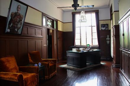 總統(tǒng)辦公室位于總統(tǒng)辦公樓(子超樓)二層的東南角,是一個(gè)由三個(gè)房間組成的套房,曾是蔣介石的辦公室。中間的一間為辦公室,臨窗有一巨形寫字臺,寫字臺上有一本臺歷,臺歷的日期仍然是1949年4月23日,這天是南京的解放日,歷史在這里定格。一張?zhí)刂频钠まD(zhuǎn)椅,會客用的沙發(fā)上方懸掛著蔣介石身穿戎裝的巨幅照片,四周的墻壁上則是嵌入墻體的文件柜,屋頂上懸掛著從法國里昂進(jìn)口的磨砂玻璃吊燈。辦公室東間為休息室,配有衛(wèi)生間。西間為書房和接待室。